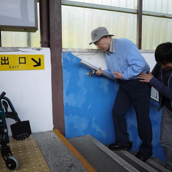 -難所である駅の階段を、見守られながらご自身で階段を上る-