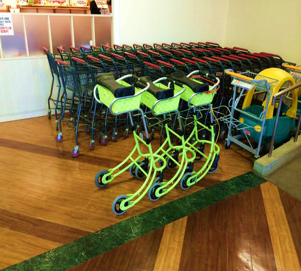 これは、特に変形性膝関節症等で足が不自由な高齢者の方々が買い物を通してリハビリ(運動)ができる環境を提供し、ひいては高齢者の方々の引きこもりも解消することができる。