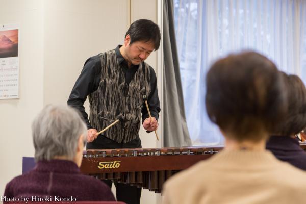私が見学させていただいたのは、介護付有料老人ホーム「アライブ世田谷下馬」で開催された後藤さんと打楽器奏者の藤本隆文さんが演奏する“マリンバの会”。藤本さんも著名な演奏家で、元神奈川県フィルハーモニー管弦楽団の首席ティンパニ奏者であり、東京藝大器楽科准教授でもある方だ。