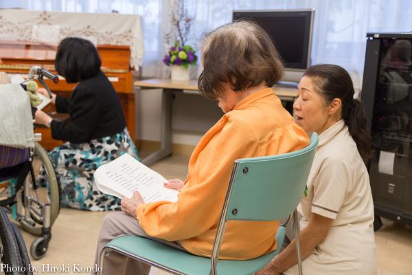 -職員の方と一緒に歌う入所者の方-