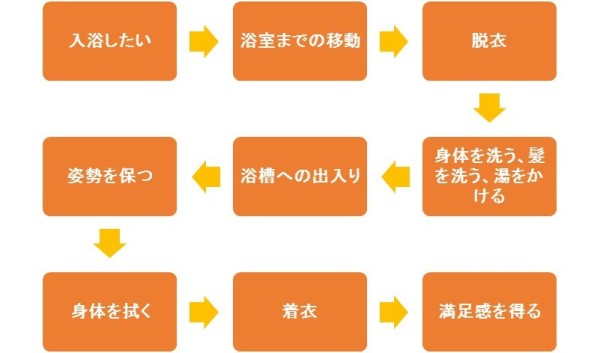 一連の動作のなかでは、浴室内を移動する、浴槽をまたぐ、座る・立ち上がる、手や足を伸ばして身体・頭を洗うという動作があります。