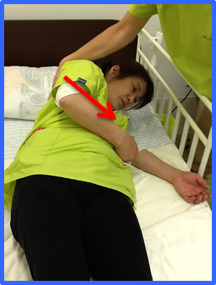 方法①:肩甲骨を支えて、寝返り方向へ介助する
