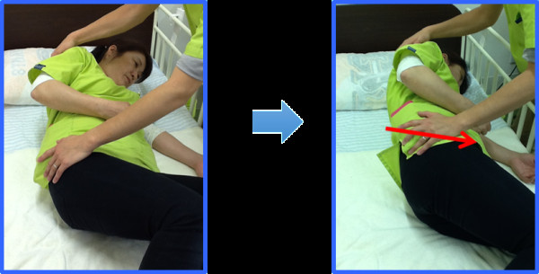 方法③:右側の骨盤を支えて、寝返り方向へ介助する