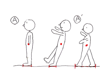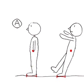 左の人は足の上に重心があります。右の人は足の上から外れたところに重心があります。今はまだ転んでいる最中ですがこのままいくと尻もちをつくのは明白です。つまり転んでしまう、ということですね。