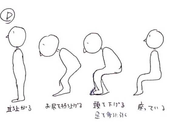 さらに立ち上がりの一連の動きをコマ割りにして、この重心の動きを追ってみましょう。★図D★