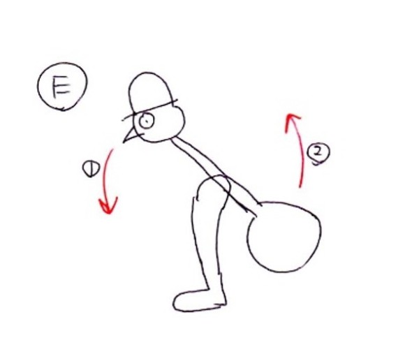 ②頭を下げて体を前に伸ばす&足を後ろに引く(前への重心の移動)