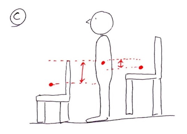 重心を上に移動させることを考えたとき、椅子が高いほど重心移動の距離が小さくなり動きの負担も軽くなります。★図C★
