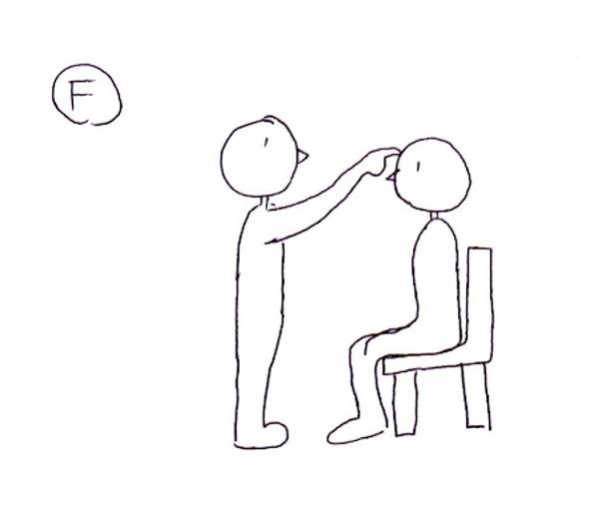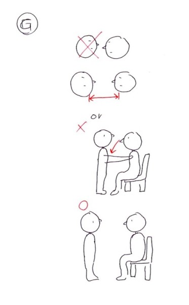頭を下げるくらい距離をとるか、斜めの位置に立つ位置を変えるなどして本人の動きを邪魔しないようにしましょう。★図G★