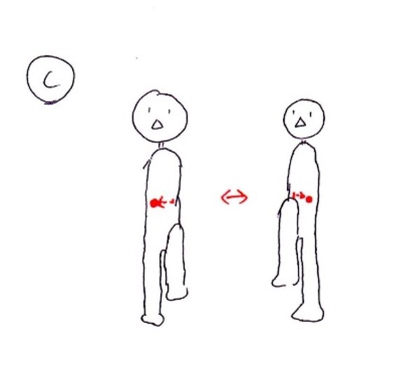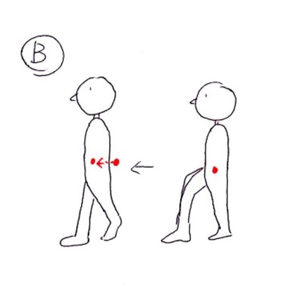 この揺れが急激 な揺れにならないように身体の各部で調整しながら歩いているんですが、重心の上下移動がスムーズにできるからこそこの揺れの調整もできているといえます。