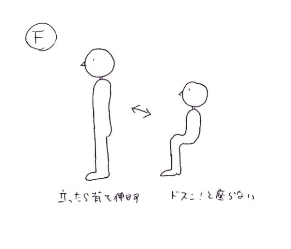 座る際にお尻がドスン!とならないように座ること。